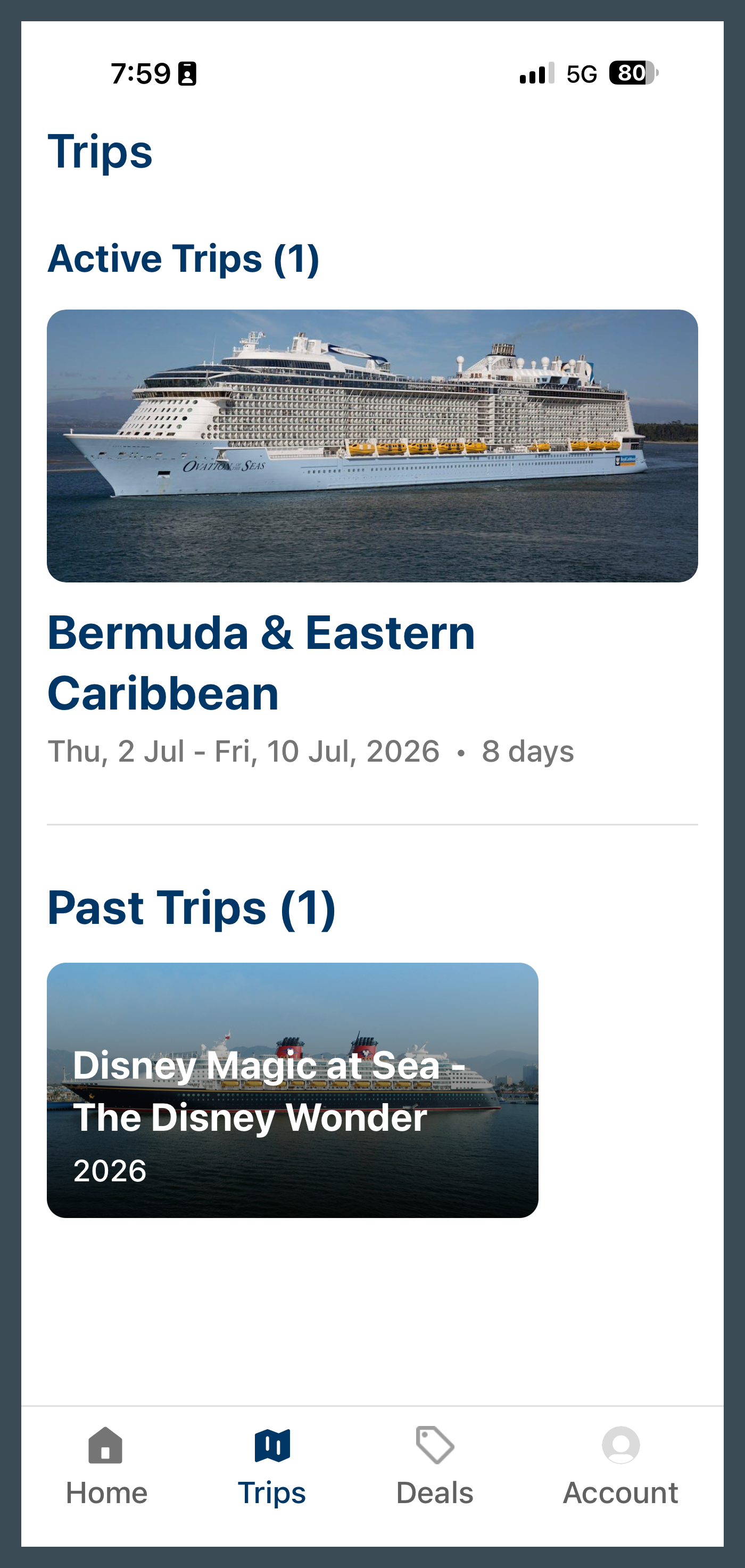 The Cruiseabout Mobile App provides access to TRIPS itineraries booked by a Cruiseabout advisor.