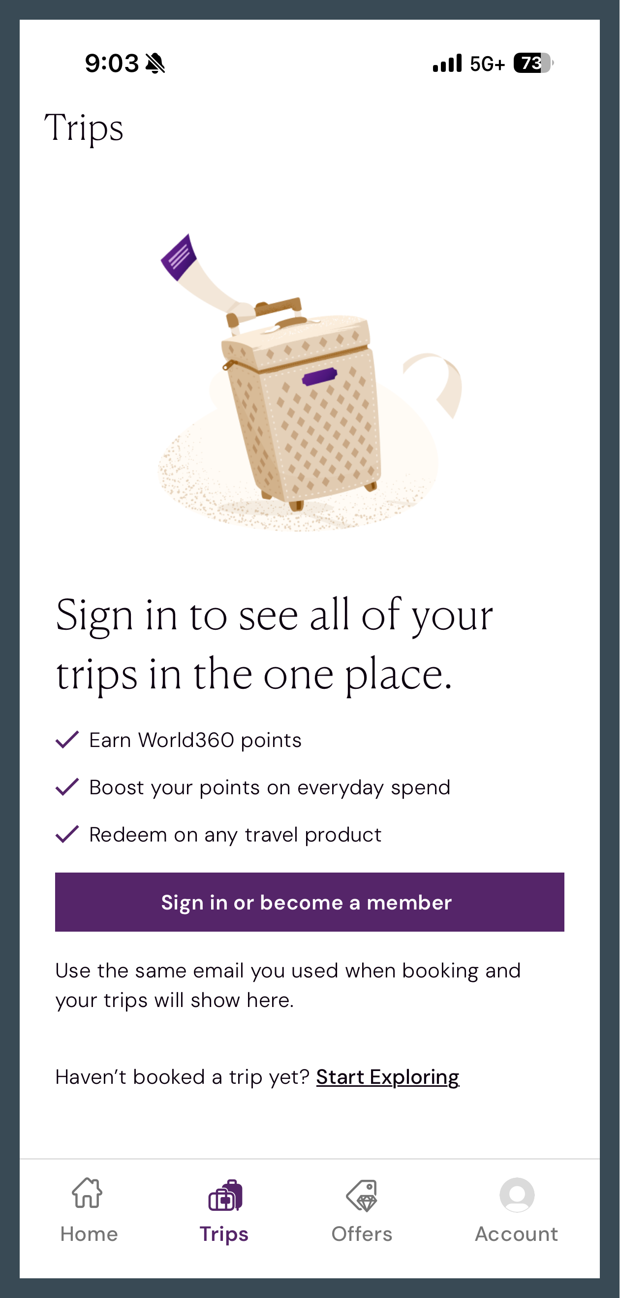 From the Home or Trips tab, select the 'Sign in or become a member' button.
