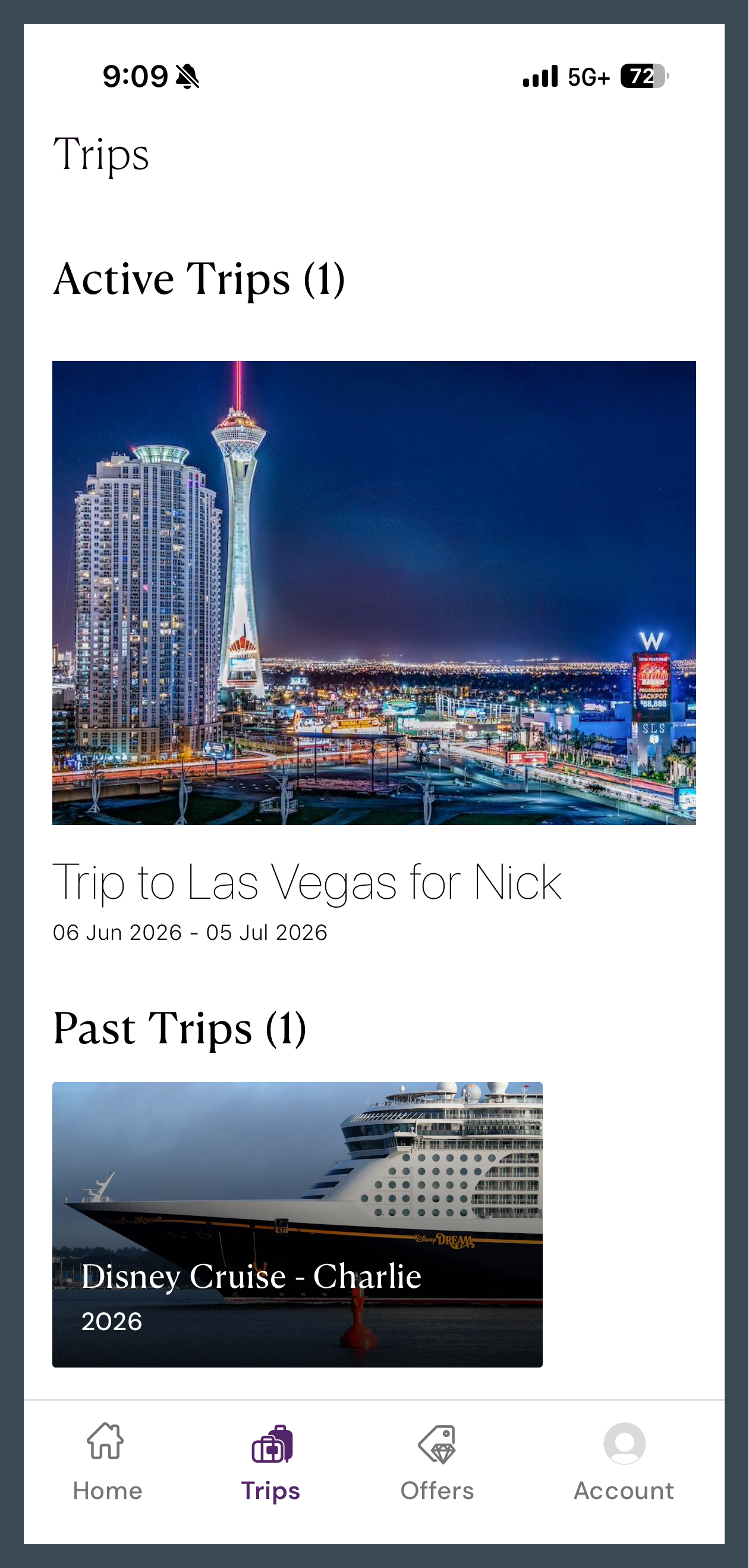 The Trips page will display Active trips, followed by a Past Trips section at the bottom.
