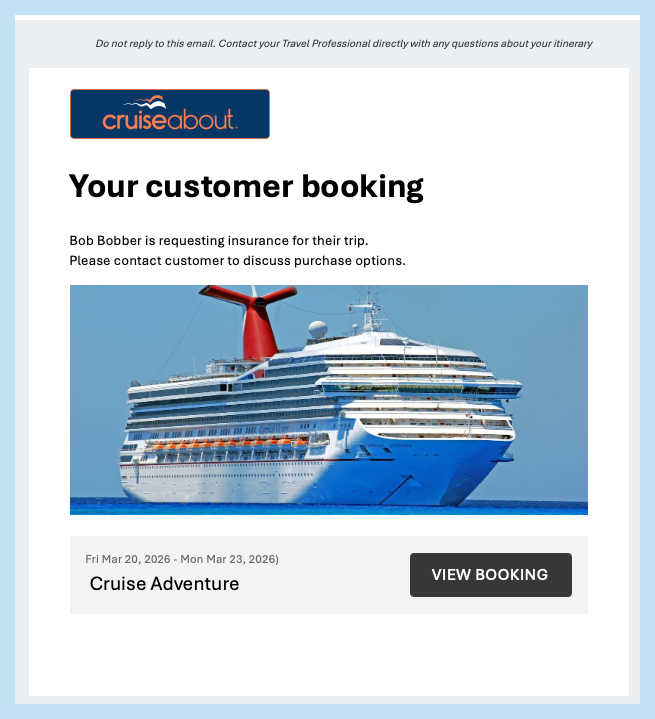 If your traveller’s Trip does not include insurance, our cross-sell functionality lets them request an insurance quote from you, their travel advisor.